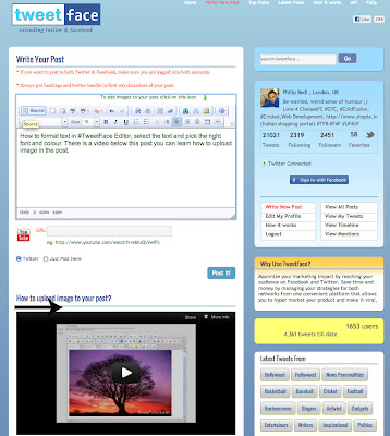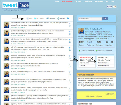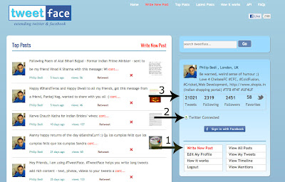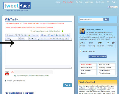 Arrow 2: Shows you are connected to Twitter, if you have FaceBook account, then you can login using FaceBook and Tweetface can post on both social media platforms in one click.