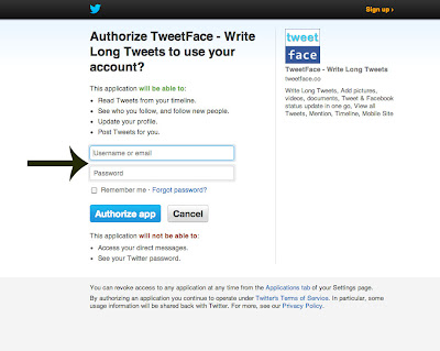 here TweetFace send your request to Twitter on twitter website, Twitter present you a login screen, login with your Twitter username/ password. TweetFace don't have any login screen, It doesn't save your username/ password.